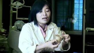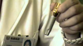 我們就這個模型來講,從上面看起來這是我們的牙齒,可是它是可以拆下來的,所以我們知道他是假牙,可是他底下為什麼是銀色的呢?這個部分是人工植牙的部分,底下是人工牙根上面再接支台齒
